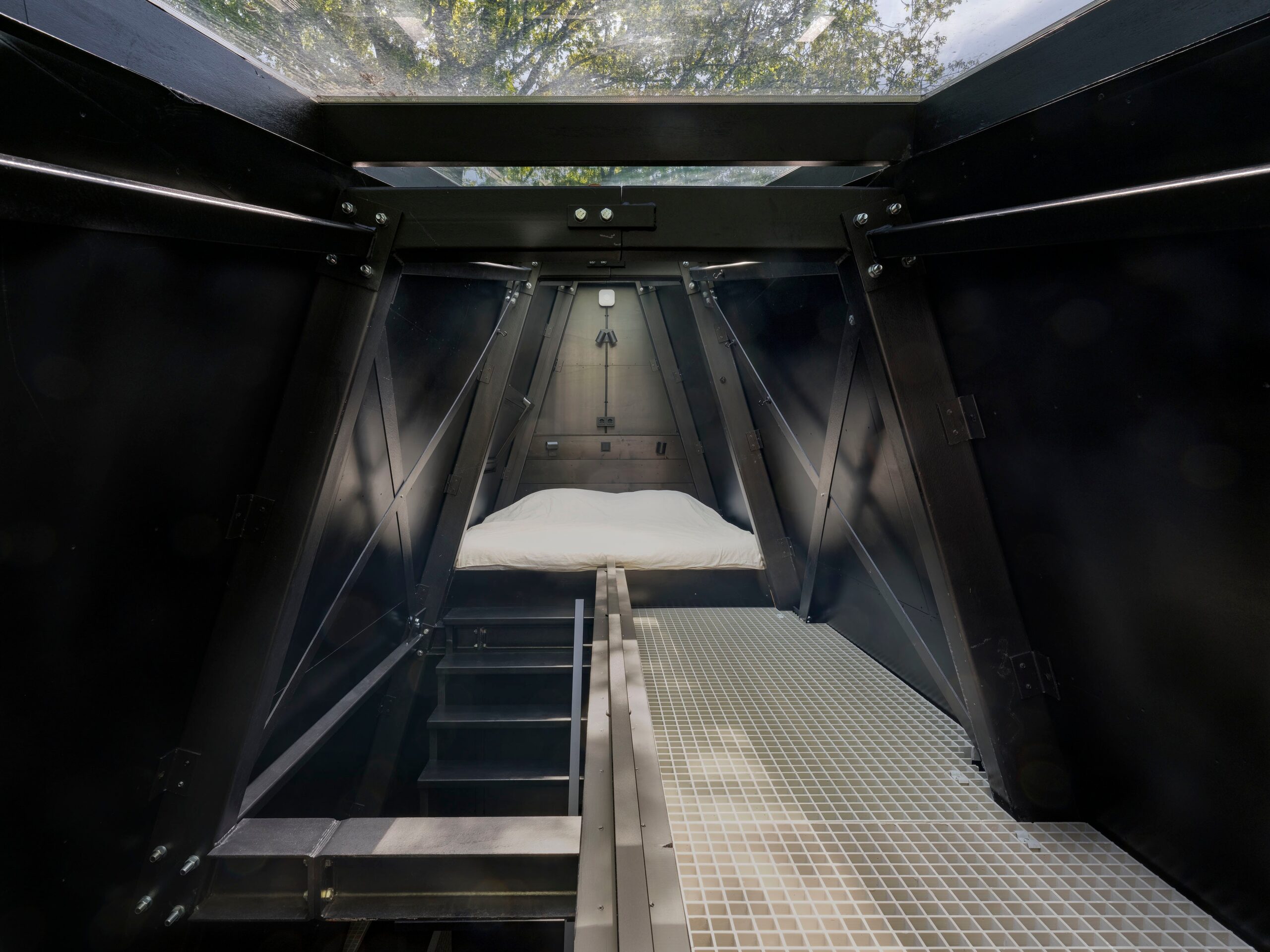 Het is een bijzonder ontworpen huis met ruime keuken, comfortabele zithoek en grote schuifpui die toegang geeft tot het terras rondom. Er zijn 5 slaapplekken (lengte 200cm) waaronder een 2-persoonsbed dat weids zicht biedt op de wuivende boomtoppen. De slaapvertrekken staan door een rooster in open verbinding met elkaar.