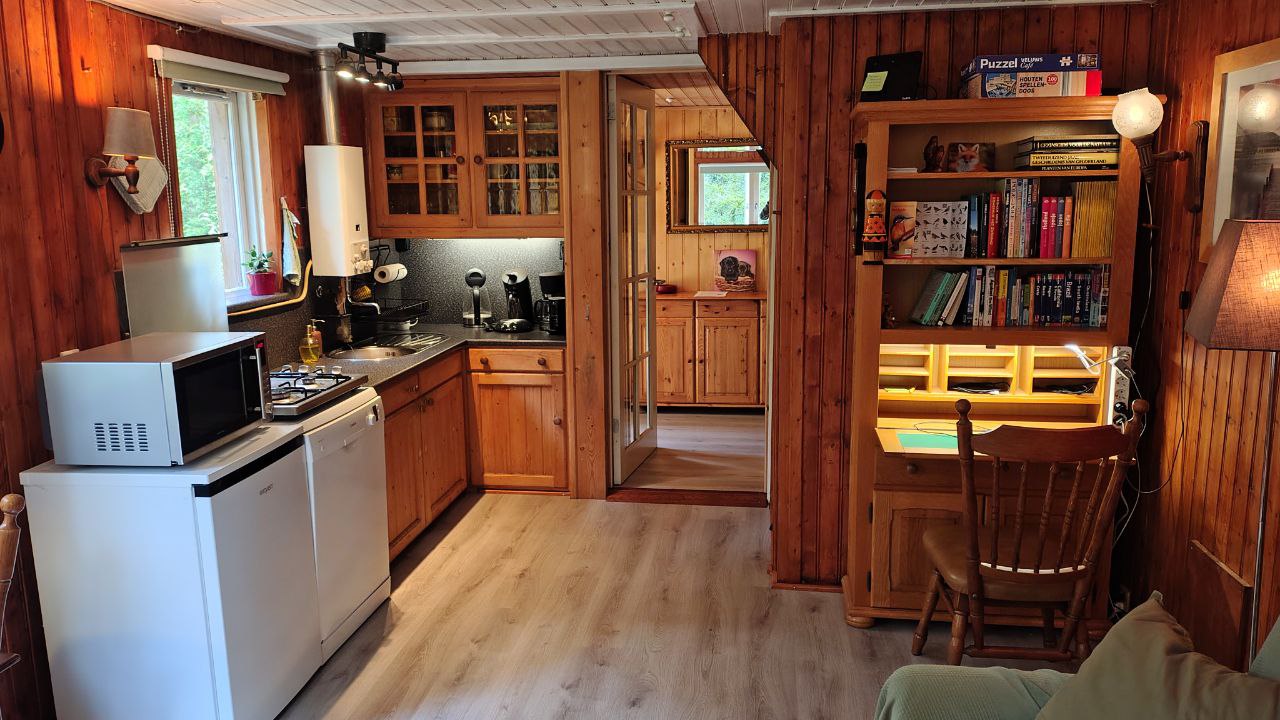 Even tot rust komen op de Veluwe, midden in het bos? Dit knusse houten huisje is van alle gemakken voorzien: een keuken met kookplaat, koelkast, combi-magnetron, vaatwasser en Senseo.