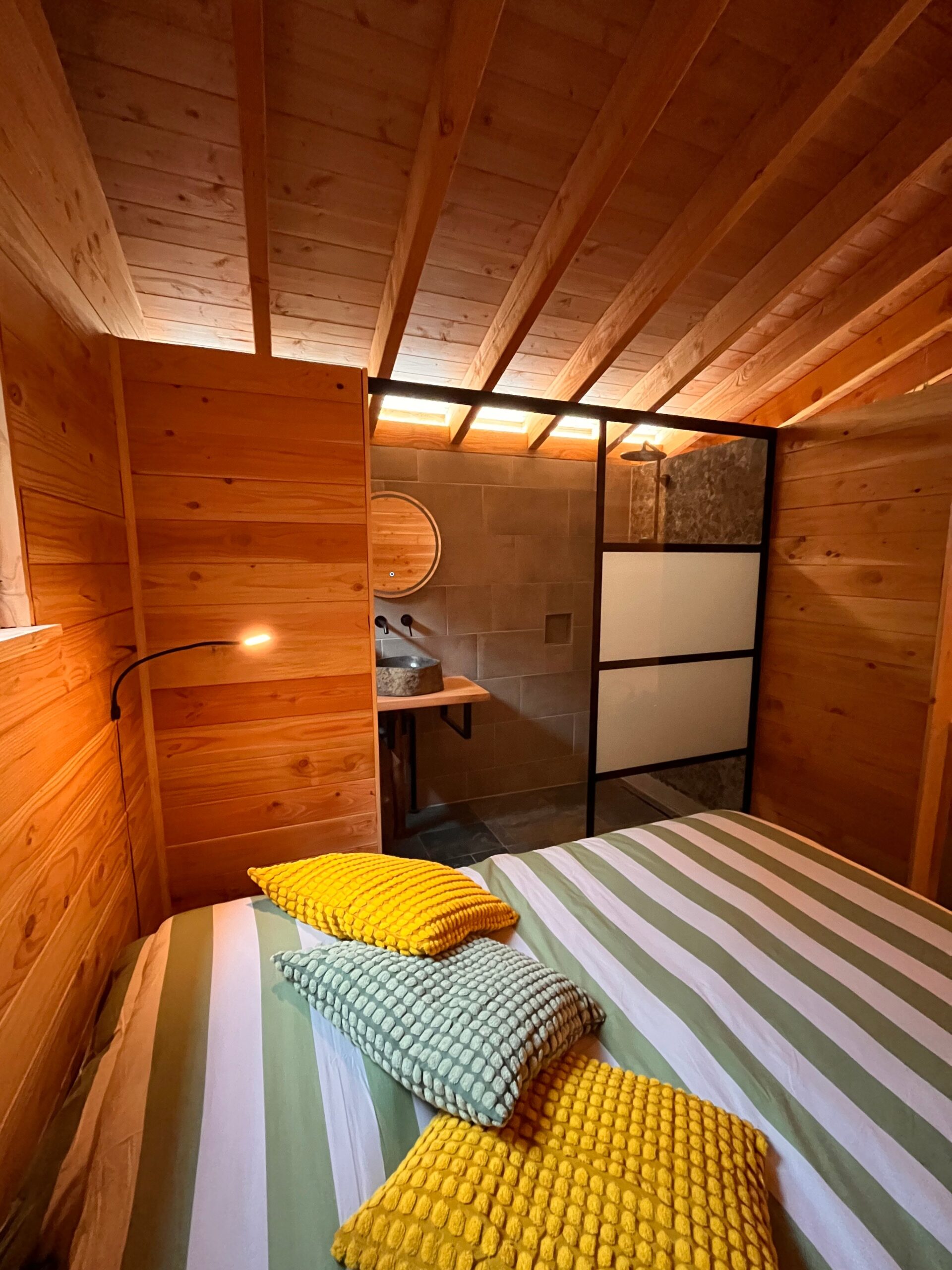 Het huisje zelf meet 32m2 en is voorzien van een kleine keuken met volledige inrichting, een slaapkamer met een badkamer voorzien van regendouche met seperate handdouche, wastafel en toilet. In het woongedeelte staan 2 heerlijke Aviator stoelen op jullie te wachten bij een gezellige…