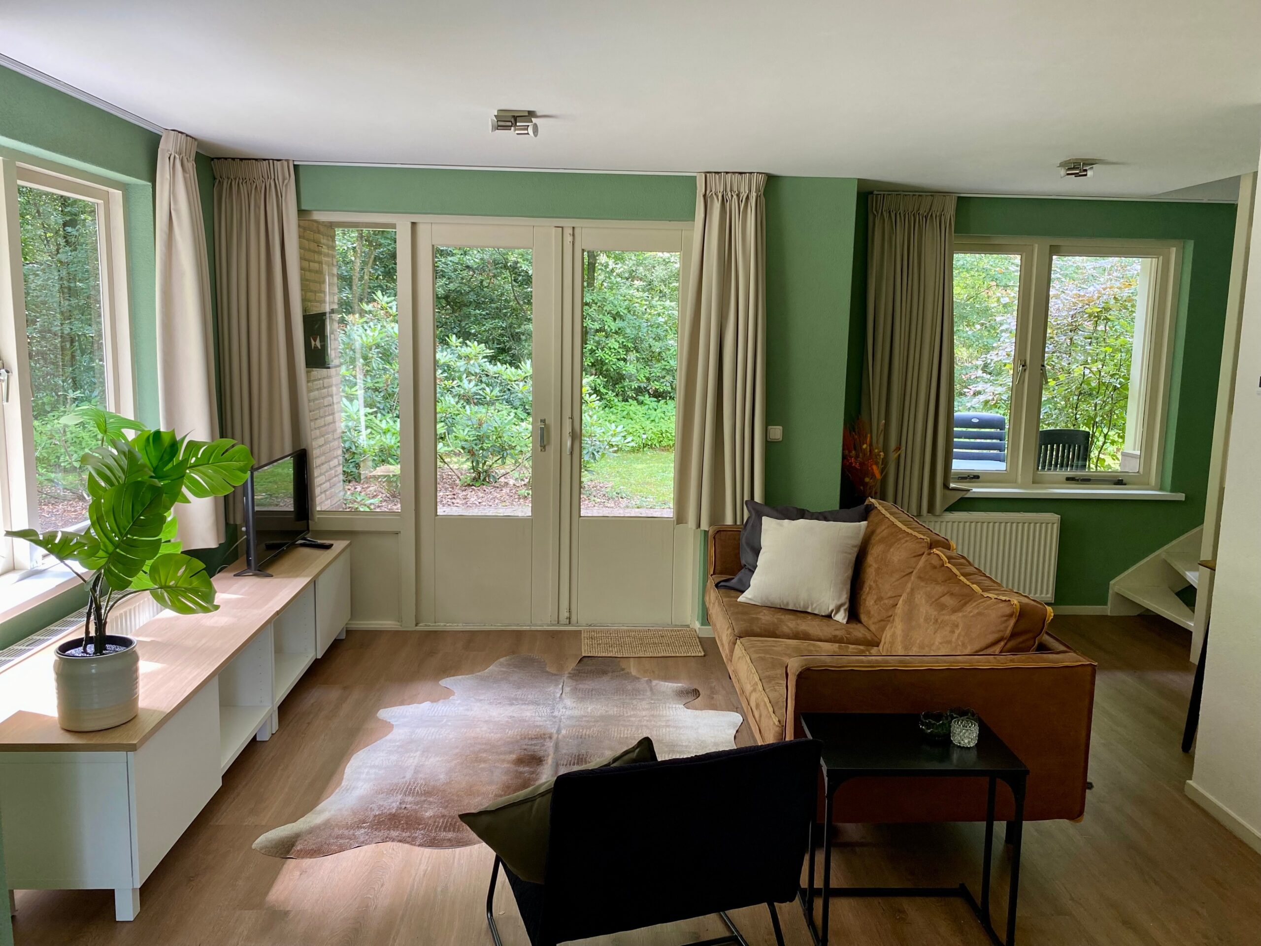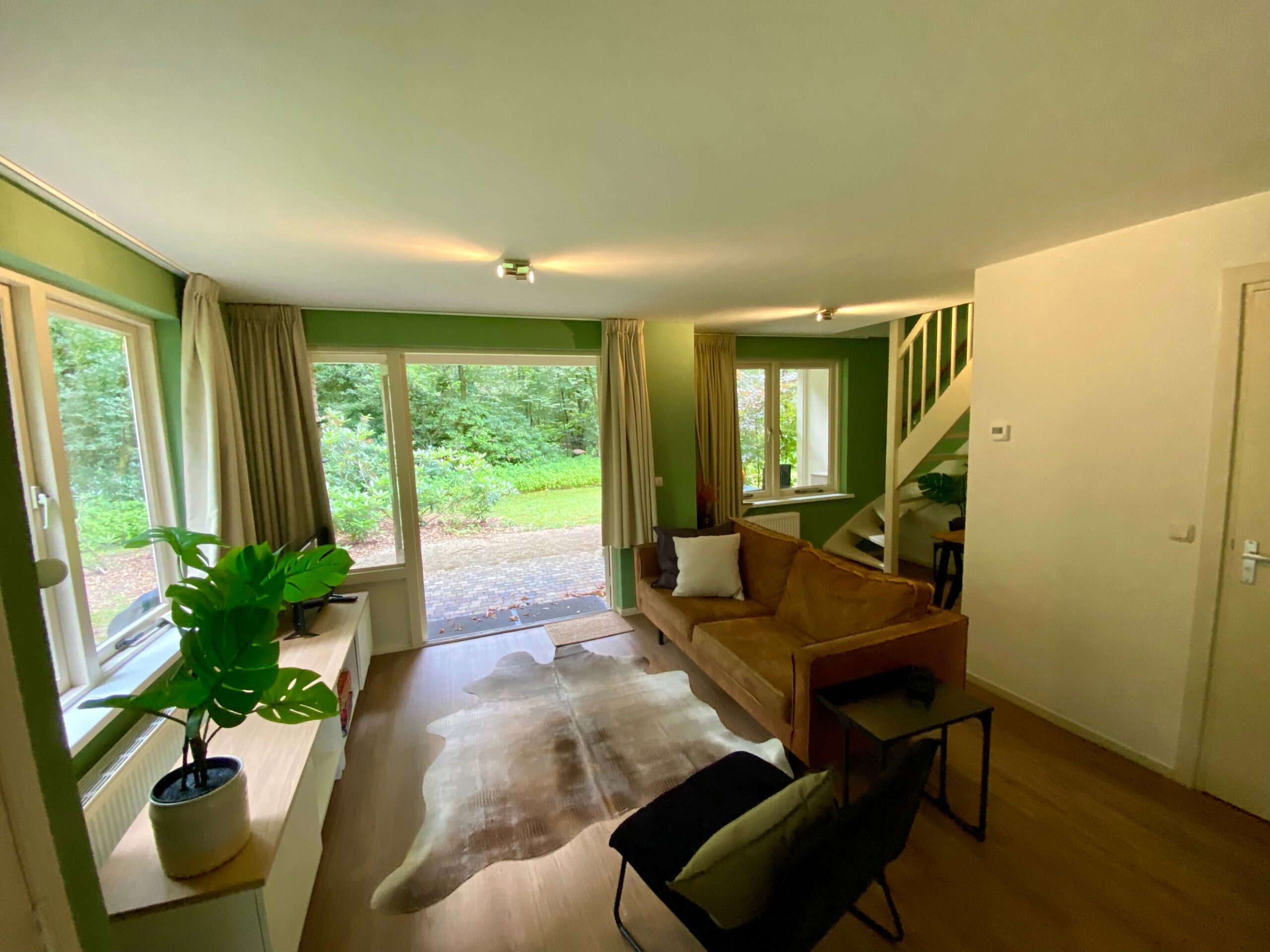 De lichte woonkamer met veel ramen biedt uitzicht op de tuin en het bos. De unieke plek van de woning aan de rand van het park zorgt voor veel privacy en u loopt zo het bos in.
