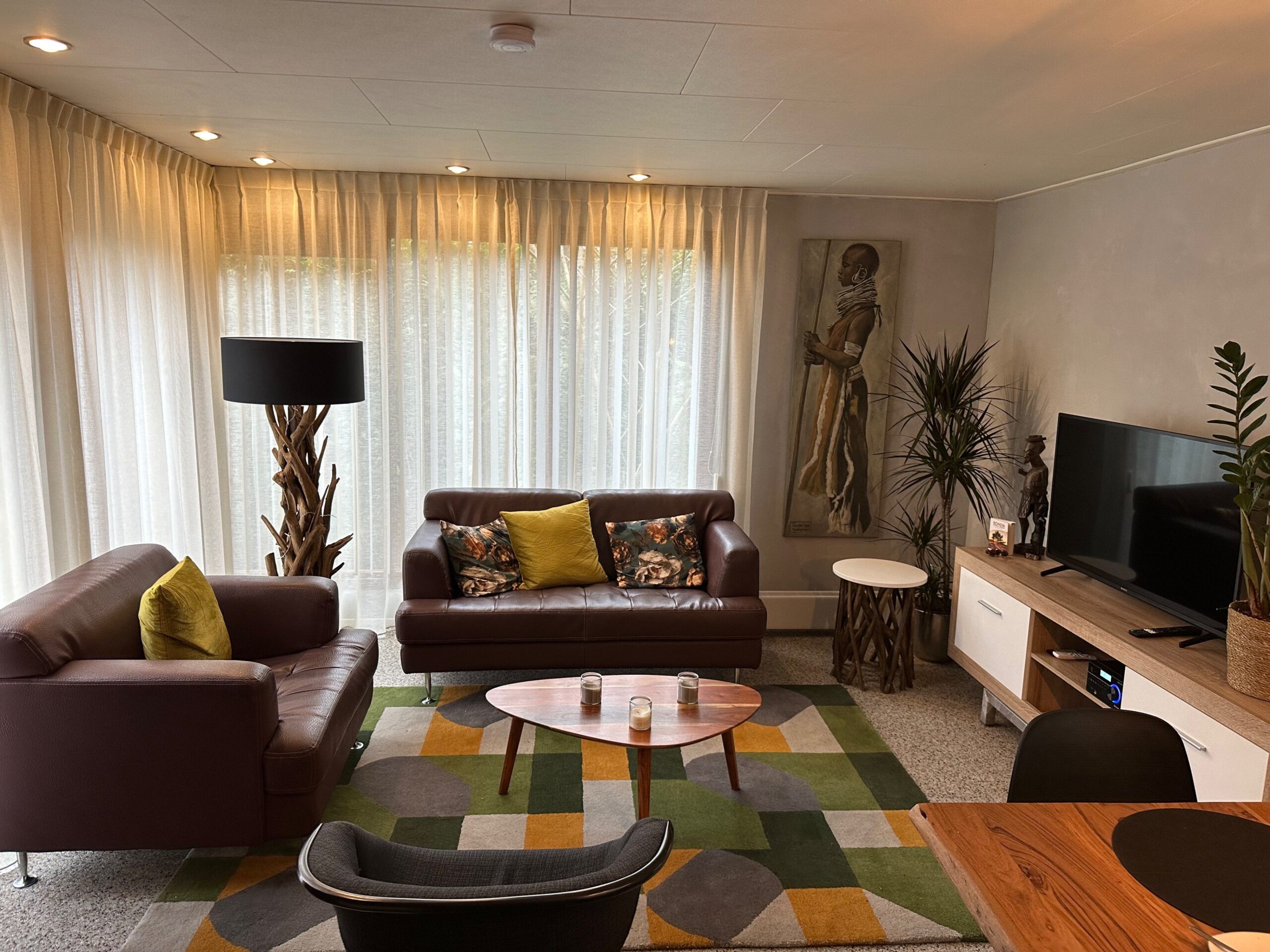 De woonkamer heeft een 2 zitsbank en stoel met een smart tv en dab radio met cd speler en sonos speaker om uw eigen muziek te streamen. de keuken heeft een koelkast met vriesvak, een combi oven, gasfornuis, Nespresso koffiemachine en een filter koffiemachine, waterkoker en uitgebreid keukengerei. Een slaapkamer met een 2 persoonsbed (160×200), sterrenhemellamp, bedlampjes en kledingkast. Badkamer met douchecabine, wastafel, toilet en wasmachine voor een wat langer verblijf. In de schuur kunt u eventueel fietsen kwijt en er is een bolderkar, droogrek en strijkijzer met strijkplank.