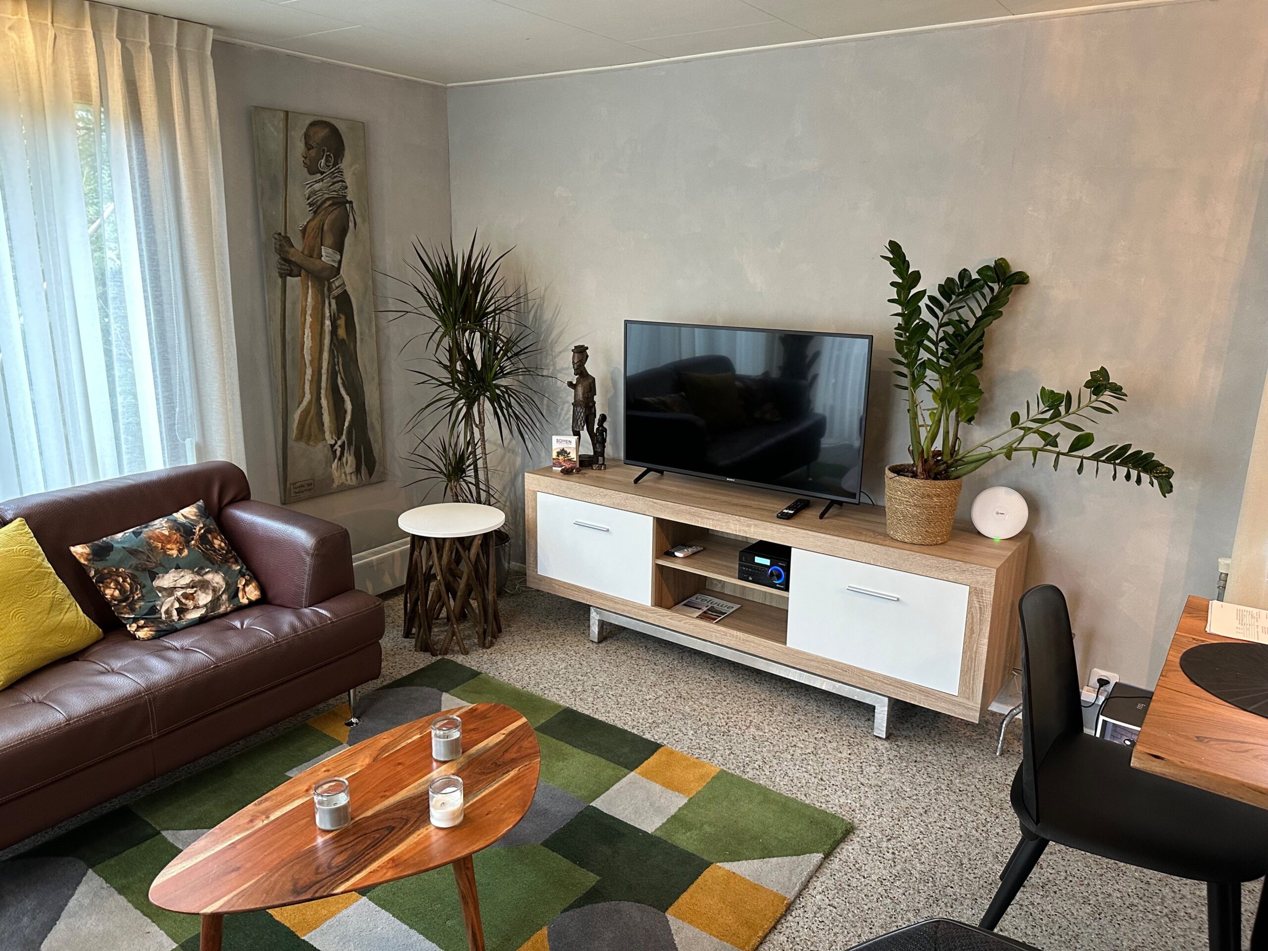 De woonkamer heeft een 2 zitsbank en stoel met een smart tv en dab radio met cd speler en sonos speaker…