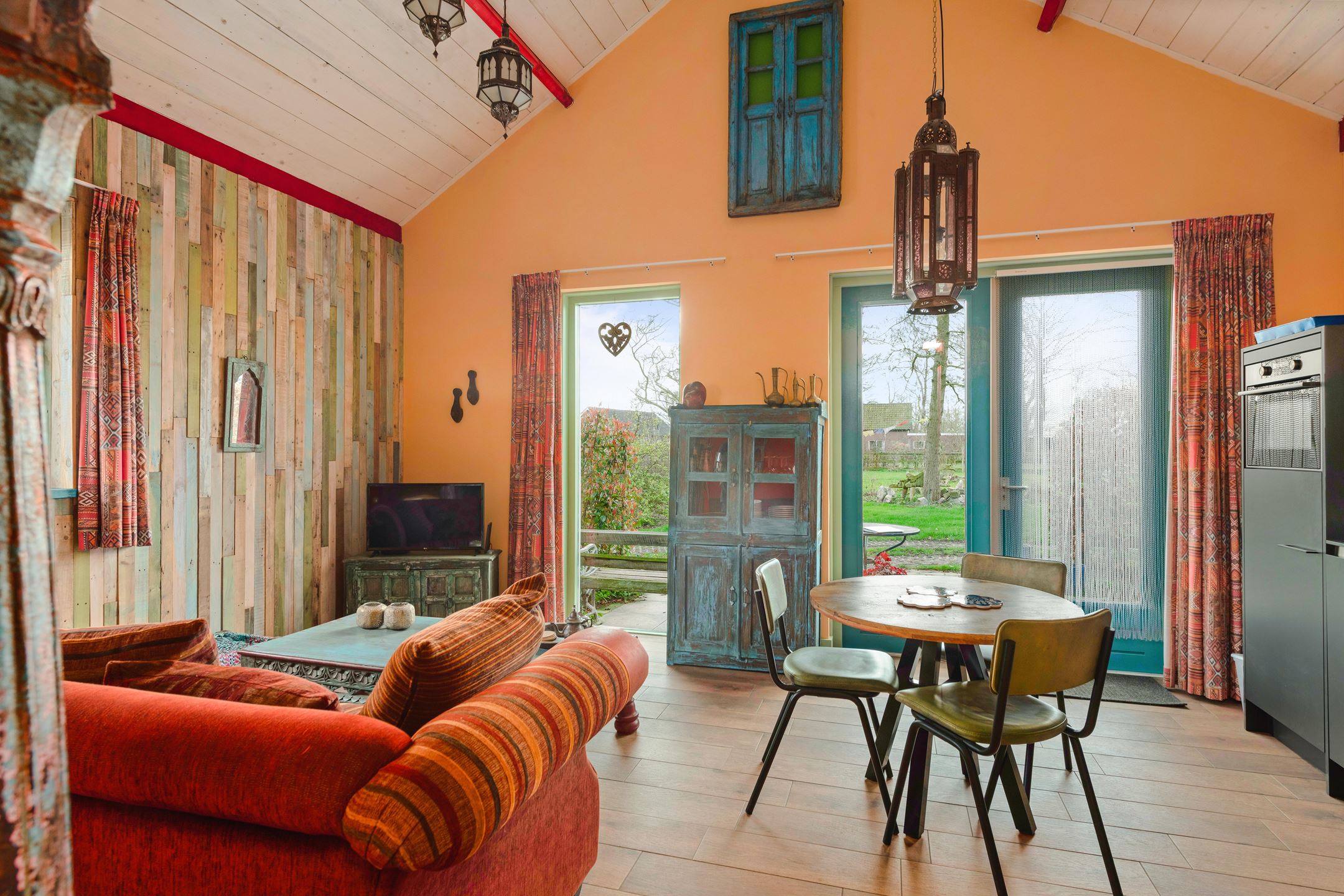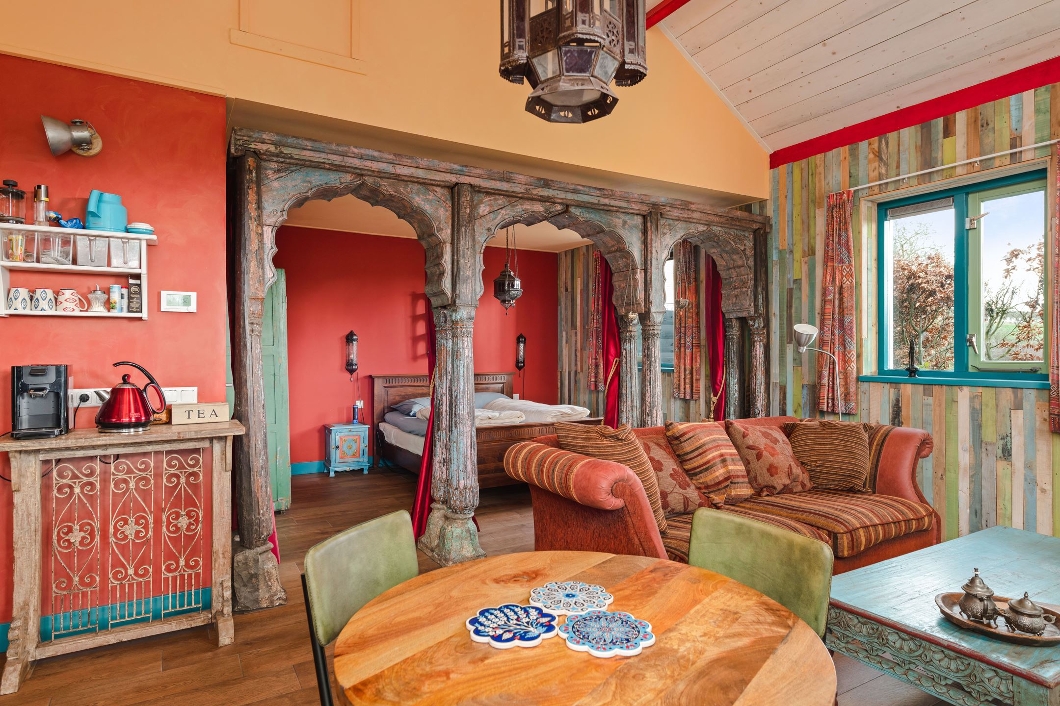 Luxe vakantiewoning met unieke 1001 nacht sfeer met antieke Indiase bogen. Geen B&B: dus geen ontbijt, maar wel met een luxe keuken. Vrij gelegen achter de dijkwoning uit 1865 met ruim uitzicht over de tuin. Bij de uiterwaarden van de IJssel, dichtbij de Veluwe en Deventer. De woonkamer met keuken en sfeervolle Indiase bogenwand (als scheiding tussen woonkamer en slaapkamer) is romantisch sprookjesachtig. De badkamer heeft een luxe regendouche. Het hele huis is goed geïsoleerd en heeft vloerverwarming. Stroom wordt geleverd door zonnepanelen. Voor honden is er een gemeenschappelijke omheind hondenterrein. Deze woning biedt bijzondere faciliteiten. In de tuin zorgen de Finse sauna en kota (vuur + BBQ hut) voor een Scandinavische belevenis. Deze zijn bij ons tegen bijbetaling privé te gebruiken. U hoeft niet te reserveren, want u bent de enige gebruiker op het terrein (Kota €10 per portie hout/briketten; sauna €15 p.p. voor max 3 uur).