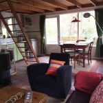 Bij binnenkomst komt u in een halletje met ook de douche/toiletruimte. Vervolgens komt u in de woonkamer met open keuken, met vanuit alle ramen zicht op het groen. De woning wordt goed verwarmd d.m.v. twee gaskachels. Bij de keuken bevindt zich een open, steile trap naar de zolderverdieping. Hier treft u een tweepersoonsbed (2x 90 bij 210cm) en een twijfelaar (1x 140 bij 200cm), beiden voorzien van dekbedden en kussens.